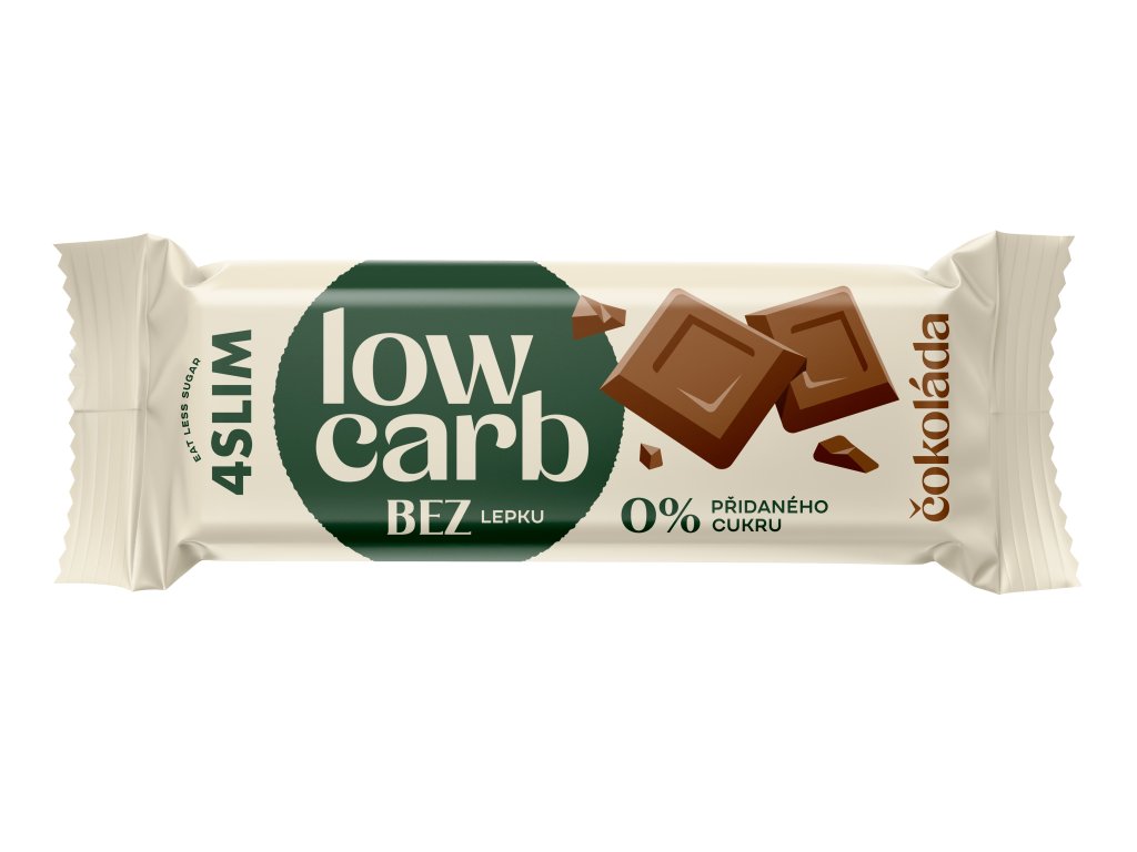 LOW CARB tyčinka s príchuťou čokolády, bez pridaného cukru, bez gluténu, bez konzervantov s vysokým obsahom vlákniny.