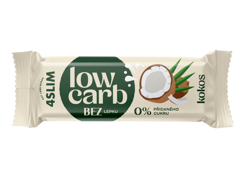 LOW CARB tyčinka kokos, bez pridaného cukru, bez gluténu, bez konzervantov s vysokým obsahom vlákniny.