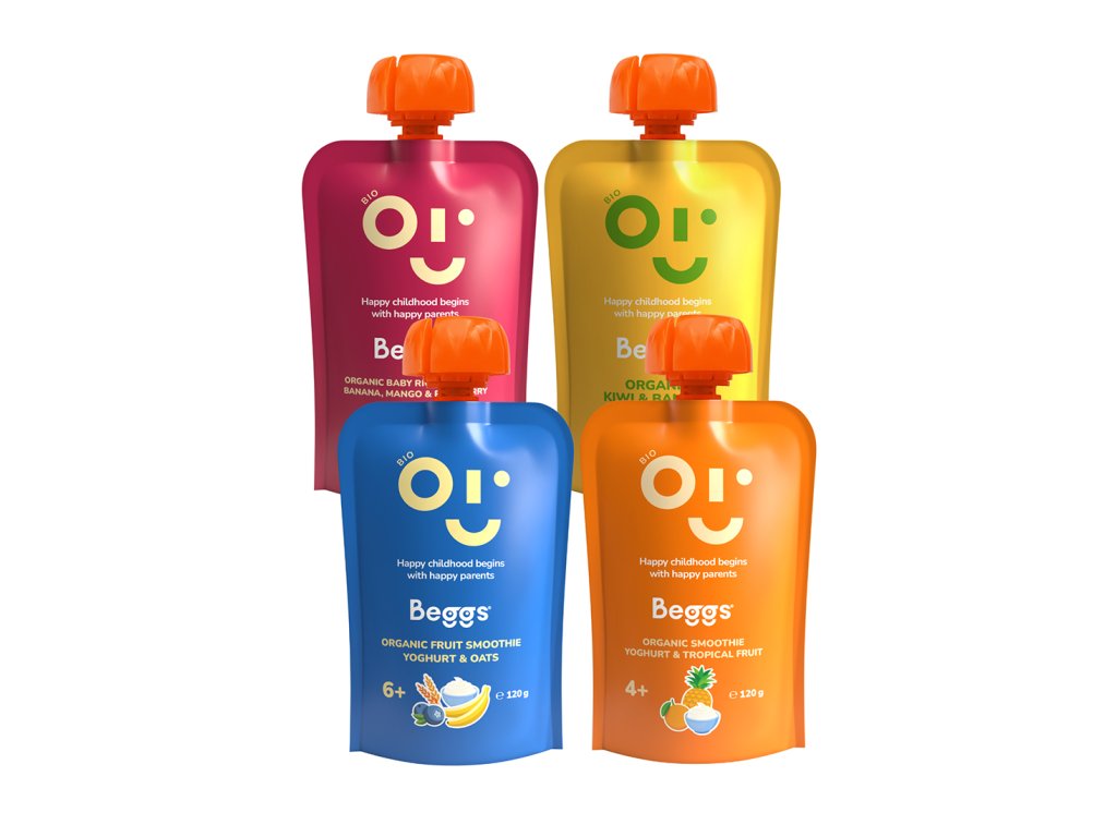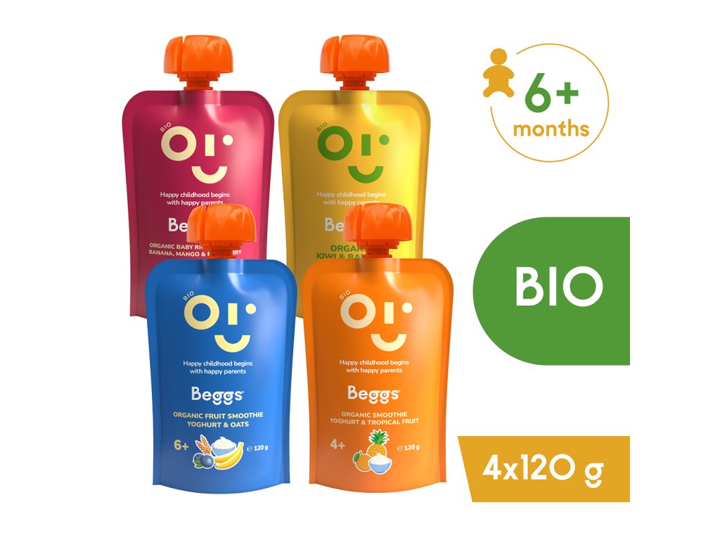 Variácia ovocných a ovocno-obilných príkrmov s jogurtom pre dojčatá a malé deti od ukončeného 6. mesiaca. V prípade Beggs BIO Smoothie s jogurtom a tropickým ovocím od ukončeného 4. mesiaca podľa odporúčania pediatra. Pasterizované. Detská potravina.