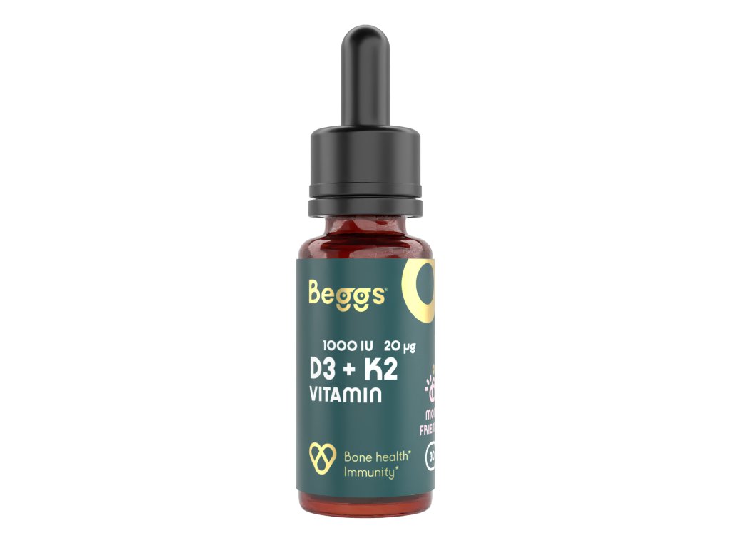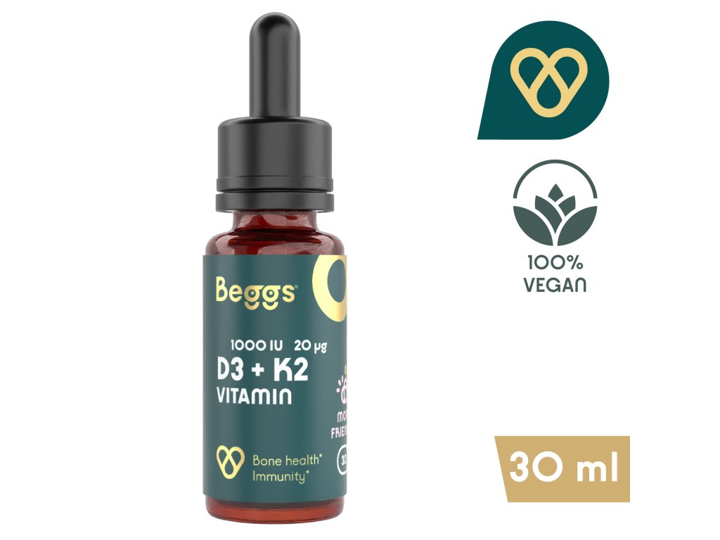 Beggs Vitamín D3 + K2 je prémiový výživový doplnok, ktorý spája vitamín D3 a vitamín K2 vo veľmi dobre vstrebateľnej forme (MK-7). Táto kombinácia vitamínov pomáha udržiavať zdravé kosti. Navyše je výživový doplnok doplnený o olivový olej z kontrolovaného poľnohospodárstva, ktorý zabezpečuje efektívne vstrebávanie vitamínov rozpustných v tukoch.