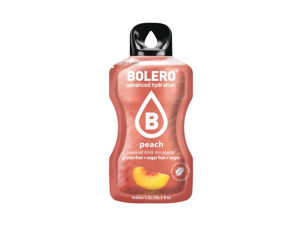 Nealkoholický nápoj v prášku s broskyňovou príchuťou, so sladidlami. BEZ UMELÝCH FARBÍV A ARÓM. Bolero je originálna a široko použiteľná zmes. Môže sa miešať s vodou, mliekom, čo je obľúbené najmä u detí, a dokonca aj s alkoholom, čo obľubujú dospelí. Návod na prípravu: obsah vrecúška rozmiešajte v 1,5 litri vody.