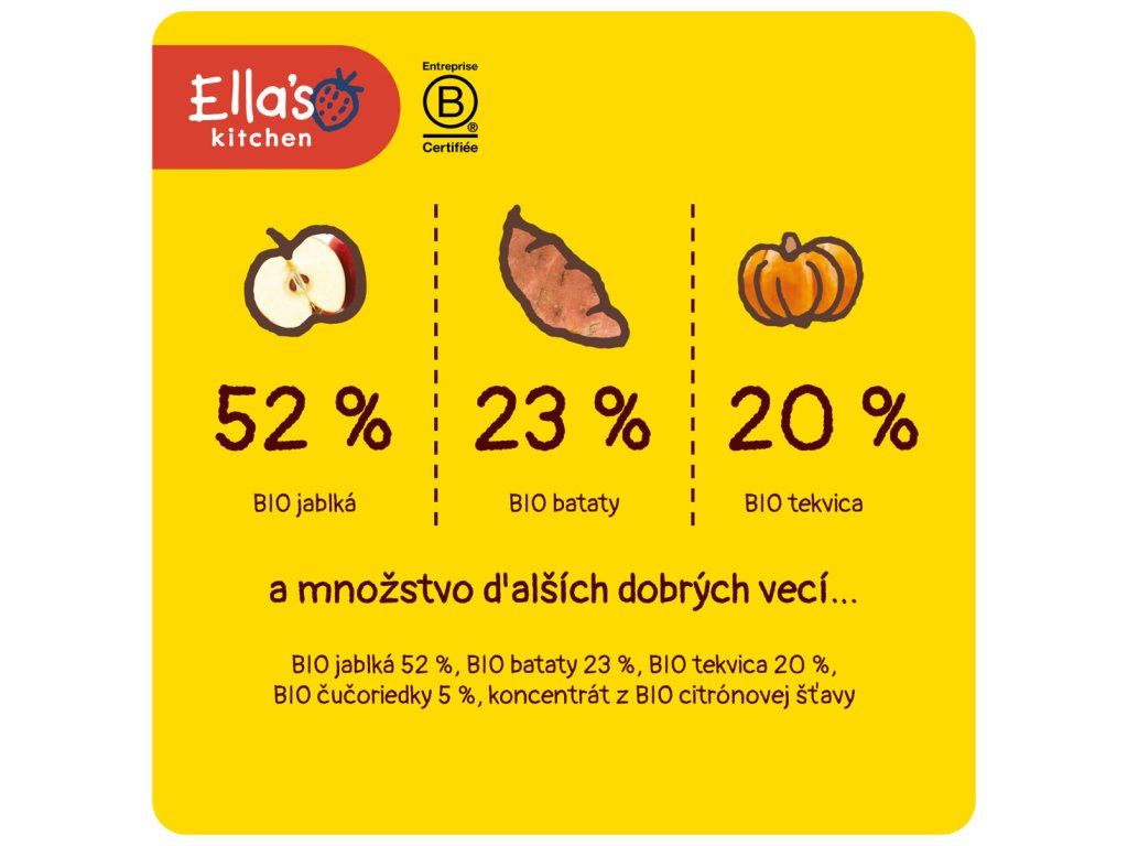 Výrobca: Ella’s Kitchen Ella’s Barn, 22 Greys Green Farm Rotherfield Greys Henley-on-Thames RG9 4QG, Veľká Británia. Oficiálny distribútor: Health Academy, s.r.o., Zbraslavská 22/49, 159 00, Praha, Česká republika.
