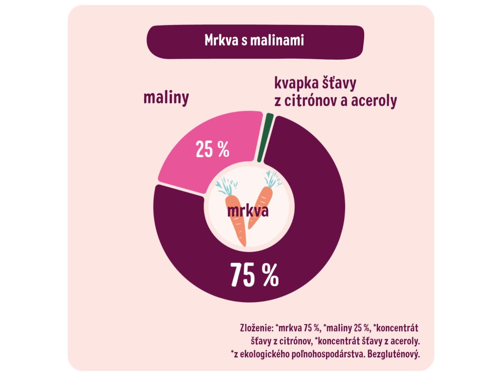 Zloženie: * mrkva 75 %, * maliny 25 %, * koncentrát šťavy z citrónov, * koncentrát šťavy z aceroly. *z ekologického poľnohospodárstva. Bez lepku.