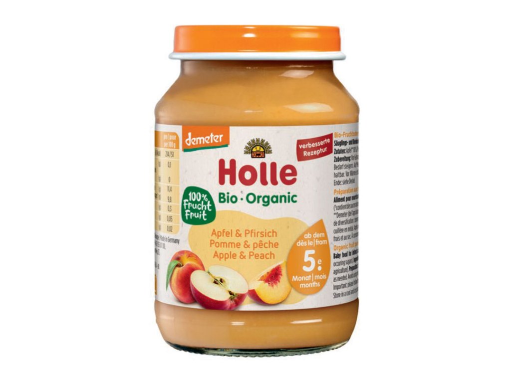 Ovocný príkrm pre osobitné výživové účely detí od ukončeného 5.mesiaca, pokiaľ lekár neurčí inak. Chutný príkrm z broskýň a jabĺk bez pridaného cukru1 a soli.