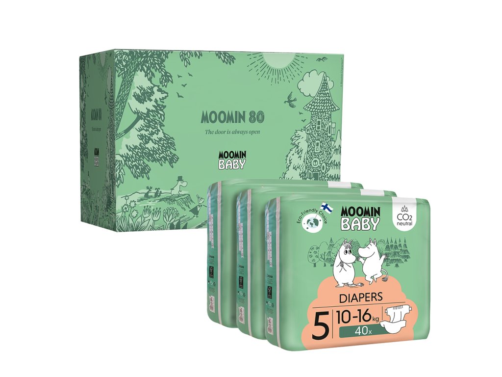 Moomin Baby 5 Maxi 10–16 kg (120 ks), jubilejné mesačné balenie eko plienok v darčekovom boxe